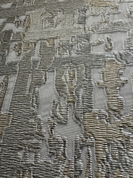 Modern, impressive non-woven wallpaper with an unusual design - the background imitates a fine beige semi-gloss fabric, wallpaper texture created by blue and gold metallic "fibers".