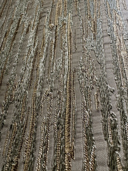 Luxury non-woven wallpaper with vinyl surface - silk fabric design with a soft semi-gloss with metallic embossed textures in shades of metallic green, gold lines. The colours and reflections on the wallpaper change according to the impact of the light.