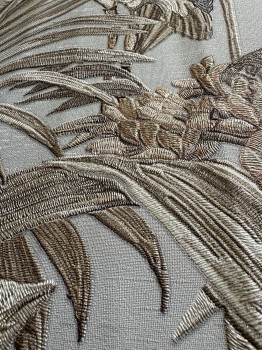 Luxury non-woven wallpaper with vinyl surface - light grey background with a soft semi-gloss, metallic textures in shades of metallic brown-beige. The colours and reflections on the wallpaper change according to the impact of the light.