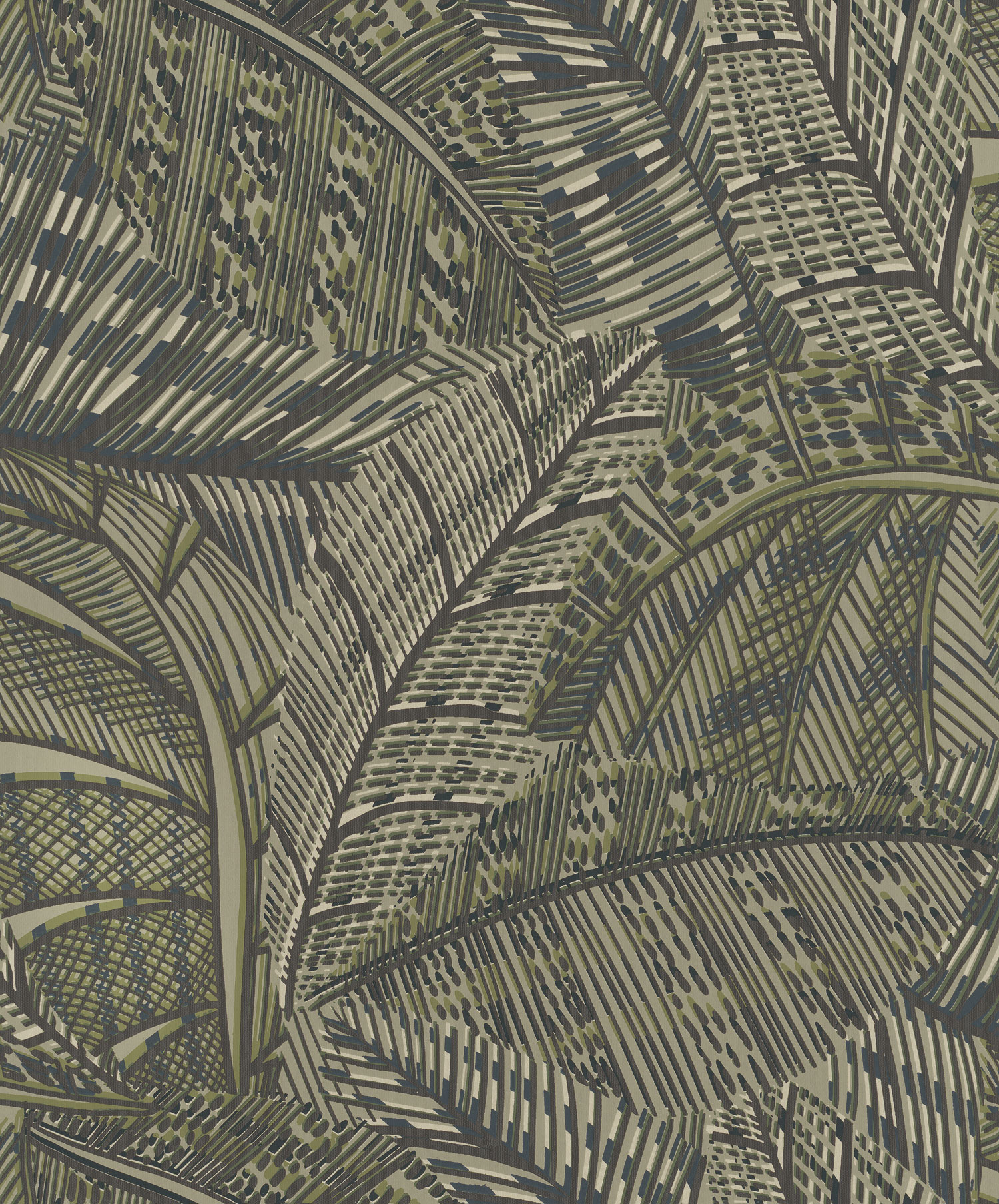 Coarsely textured non-woven wallpaper, leaf motifs in shades of green, brown and black.