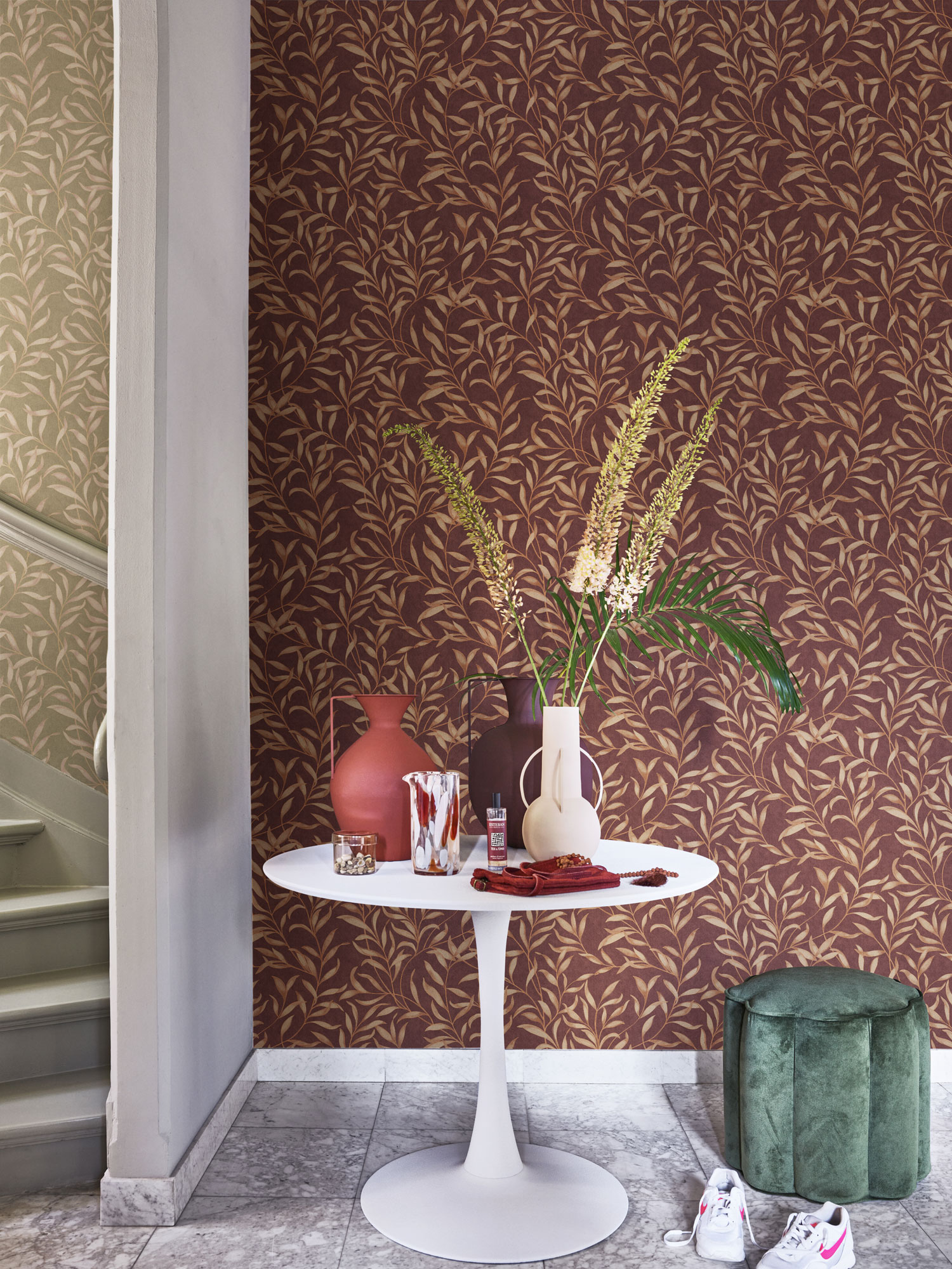 Brown-red finely textured non-woven wallpaper with a vinyl surface, motifs of twigs, leaves, in the shade of terracotta.