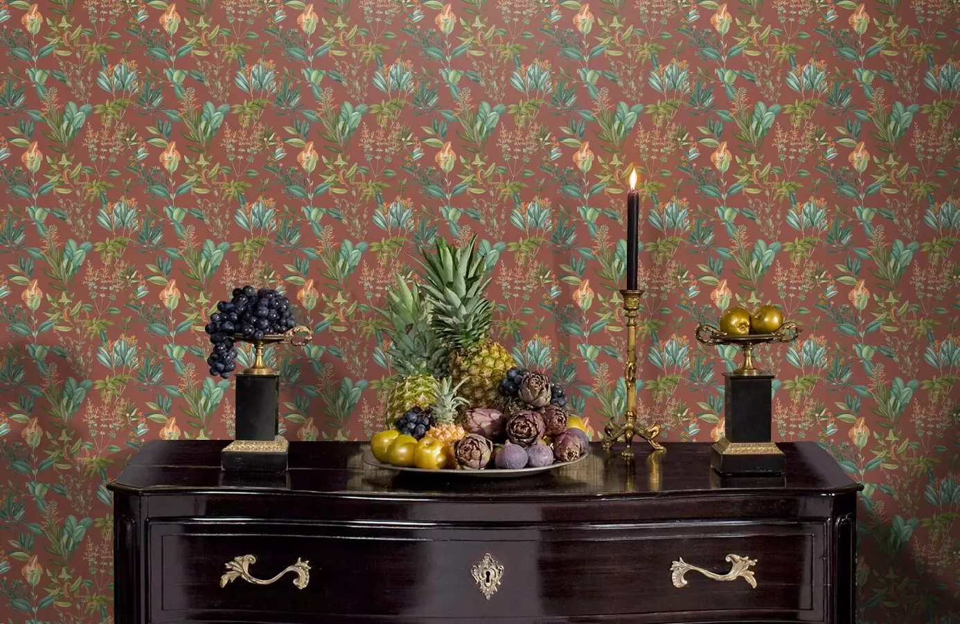 Plant and natural motifs bring peace and harmony into interior. Brown-red background, pattern shades of green and orange, fine fabric texture. Can be easily combined with related patterns.