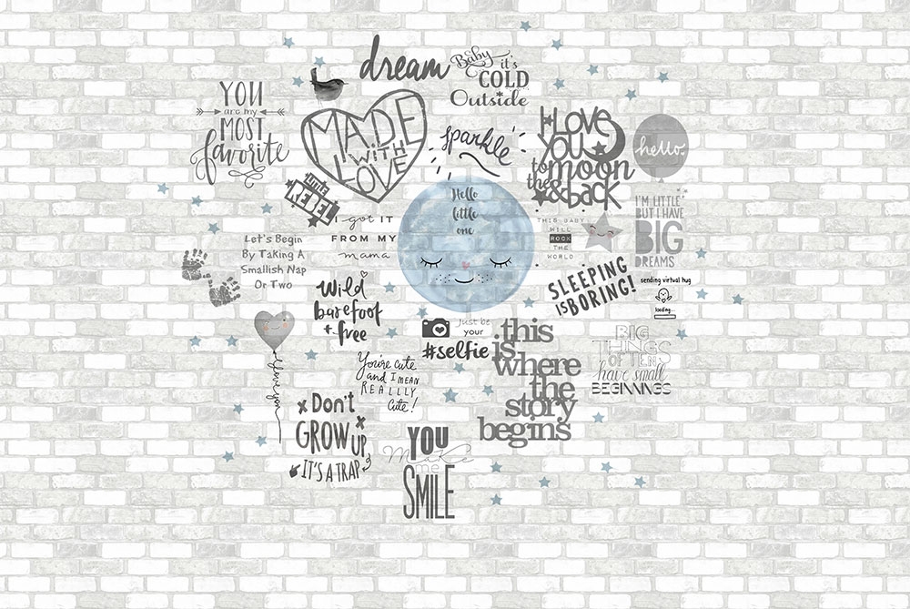 Brick wall pattern with texts and pictures. Non-woven, digital print.