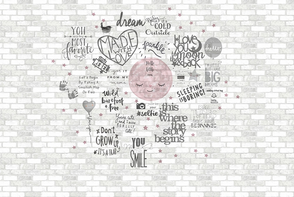 Brick wall pattern with texts and pictures. Non-woven, digital printing.