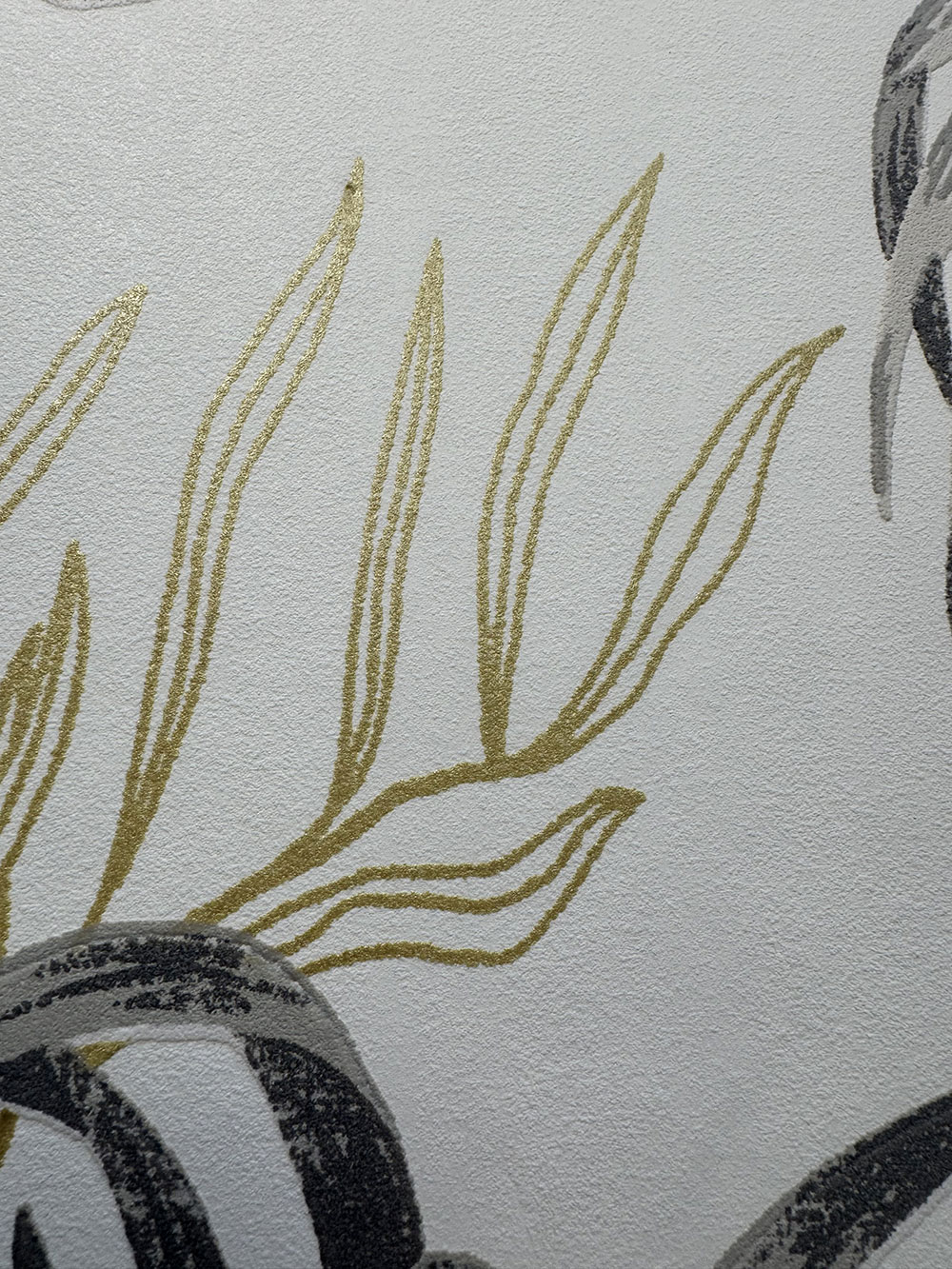 Cream non-woven wallpaper with vinyl surface, motifs of tropical leaves in shades of gray and ocher, with golden highlights in places.