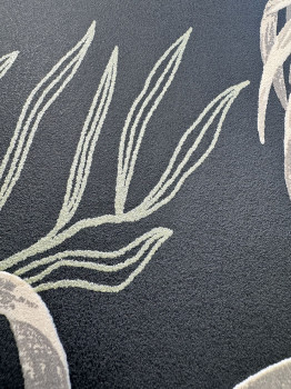 Black non-woven wallpaper with vinyl surface, tropical leaf motifs in shades of gray, ocher and beige, with metallic reflections in places.