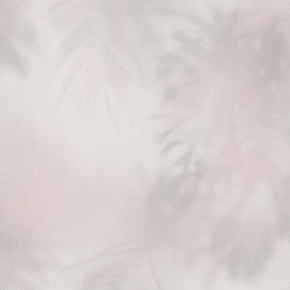 Exclusive wallpaper with original motifs of soft focus palm leaves in shades of gray-white, with a light pink touch.