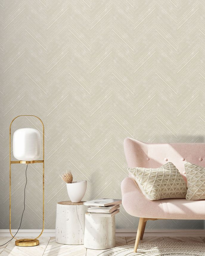 Non-woven wallpaper with vinyl surface, fabric texture, zigzag pattern, shades of beige, gray and cream.