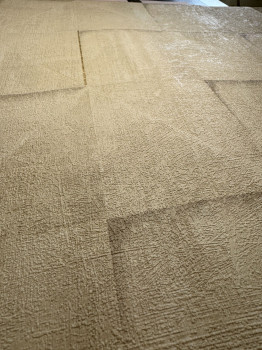 Finely embossed beige-gray geometric non-woven wallpaper with vinyl surface, 3D tiles imitation, gold details.