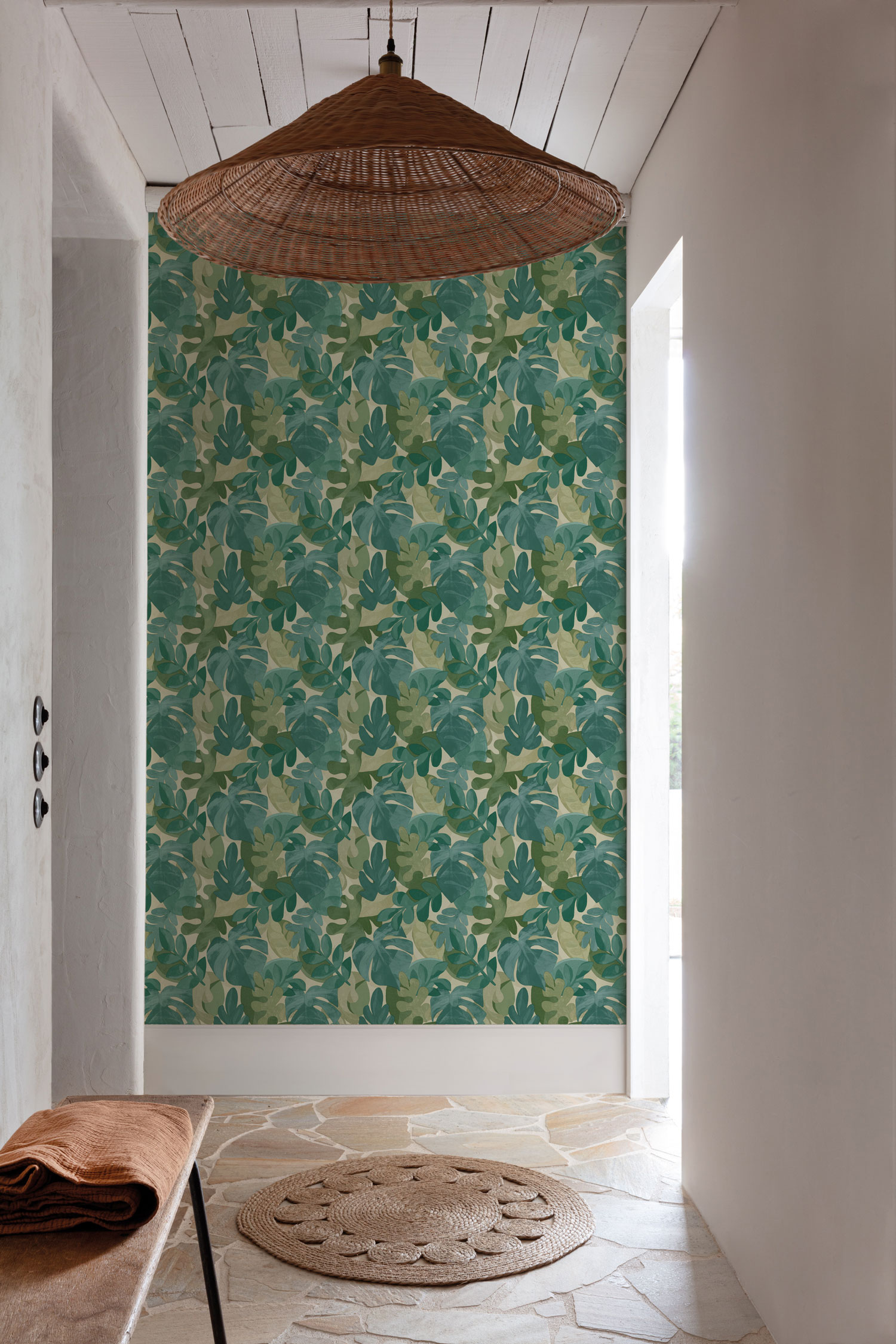 Non-woven wallpaper, leaf motifs, shades of blue and green on a beige background.