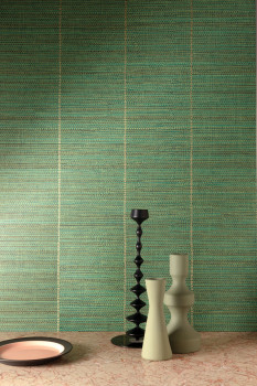 Non-woven wallpaper, coarse fabric texture, stripes, shades of green, small gold details.