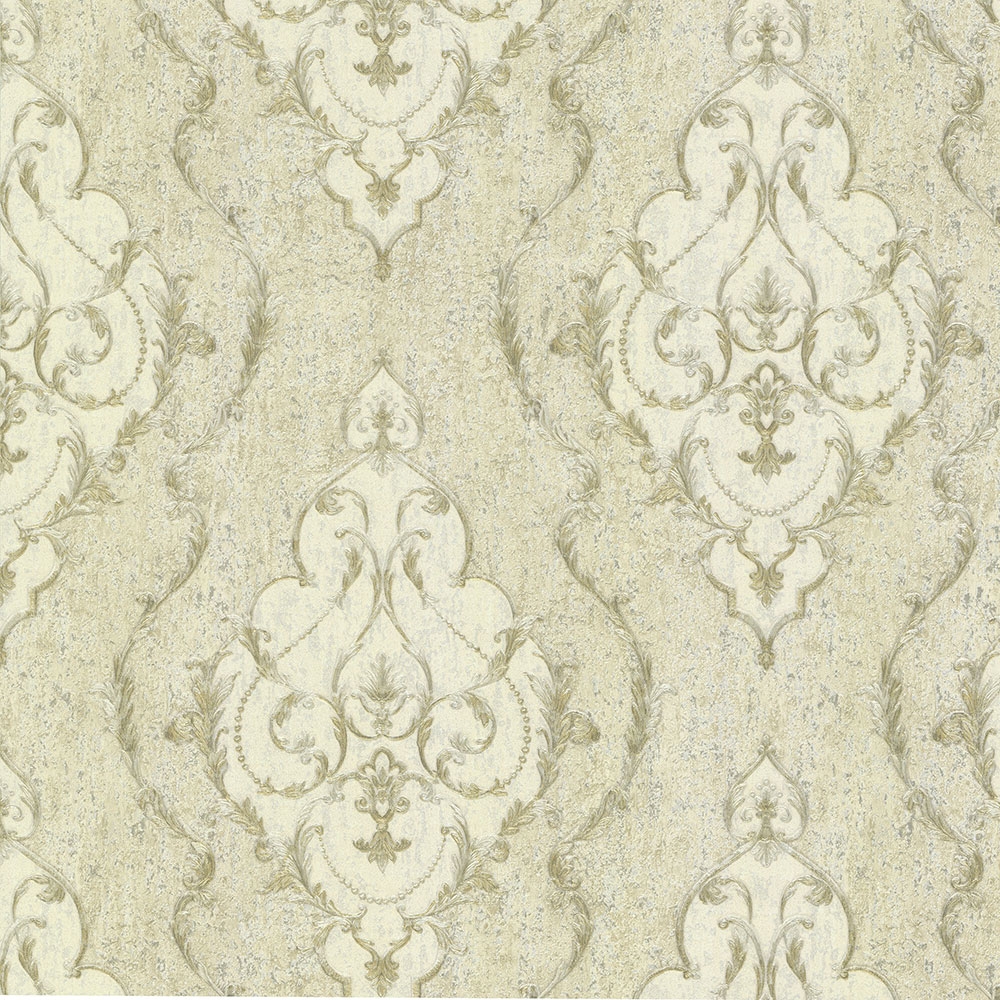 Luxurious non-woven wallpaper with a vinyl surface inspired by the beauty of Italian historic palaces - a rich baroque pattern, embossed texture in metallic light beige shades with golden reflections, gold pattern.