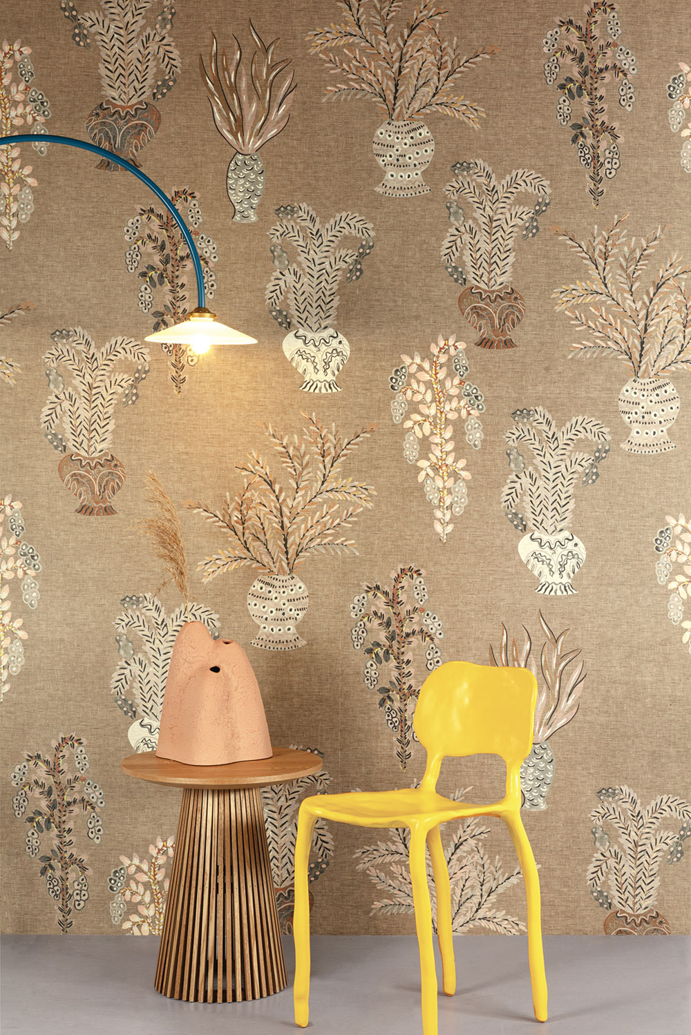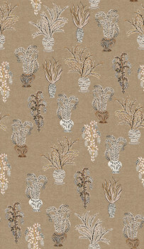 Non-woven wallpaper, coarser fabric texture, motifs of plants in vases, shades of brown, beige, pink, gray.