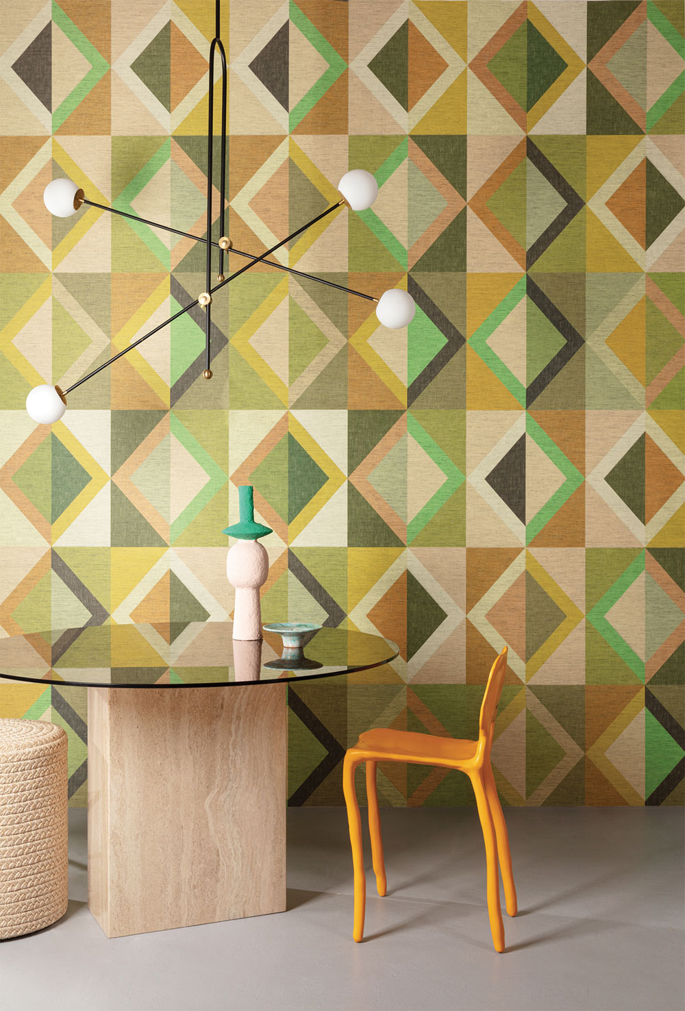 Geometric non-woven wallpaper, coarse fabric texture, shades of green, ochre, brown and beige.