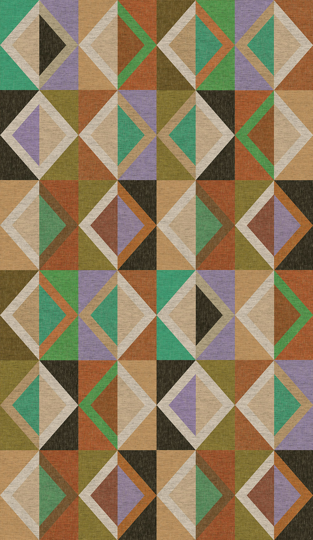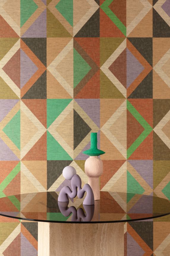 Geometric non-woven wallpaper, coarse fabric texture, shades of green, brown, purple and beige.