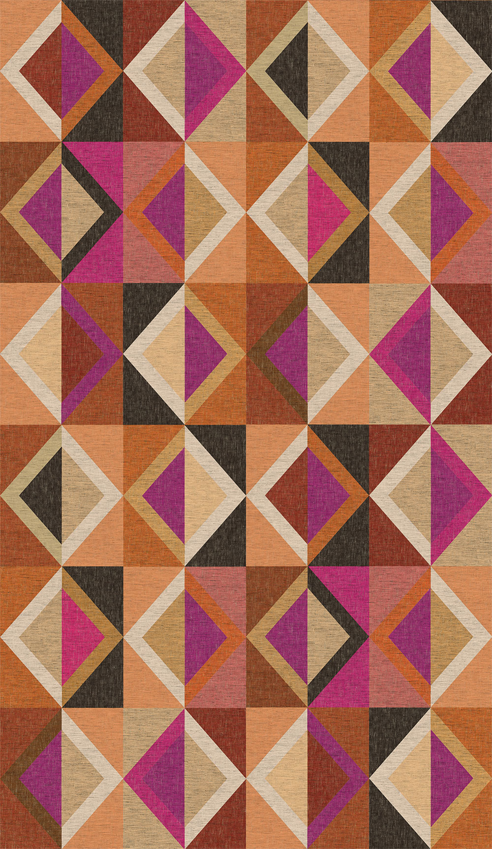 Geometric non-woven wallpaper, coarse fabric texture, shades of brown, purple, orange and beige.