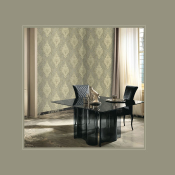 Luxurious non-woven wallpaper with a vinyl surface inspired by the beauty of Italian historic palaces - a rich gold baroque pattern,background embossed texture in gold and silver shades, golden glitters.