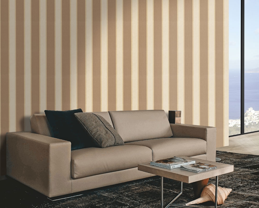 Unconventional non-woven wallpaper with stripes in shades of cream, beige and brown.