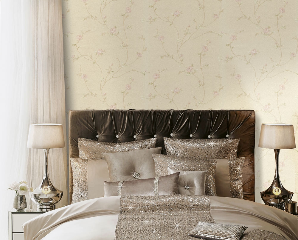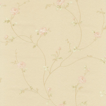 Romantic floral wallpaper - creamy background with a delicate leaf decor, a glossy pink rose pattern. Can be easily combined with related wallpapers.
