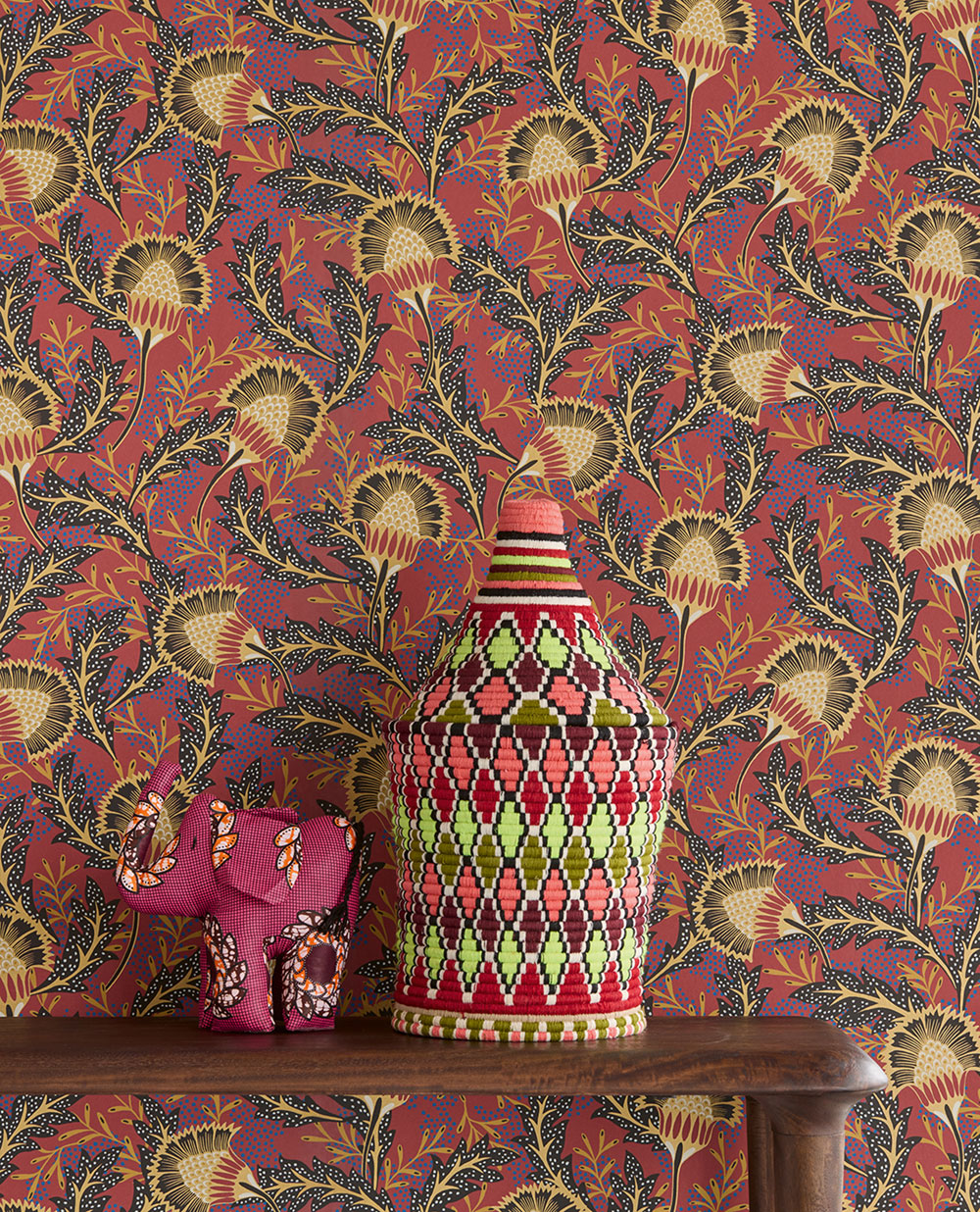 With Solange, your walls will blossom with the joyful colors of floral designs inspired by traditional African batik. Fall in love with a modern nomadic spirit through ikat-inspired patterns. Or opt for a stylish zigzag motif with delicate metallic accents, paying tribute to the beautiful Kuba fabrics. This unique collection pairs perfectly with a palette of natural shades, from vibrant tones to soft, earthy hues reminiscent of raffia and batik rugs.