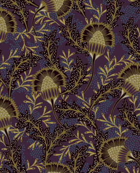 Eggplant non-woven wallpaper, unconventional floral pattern inspired by African batik, gold flowers and parts of leaves, other colors - blue, black, khaki.