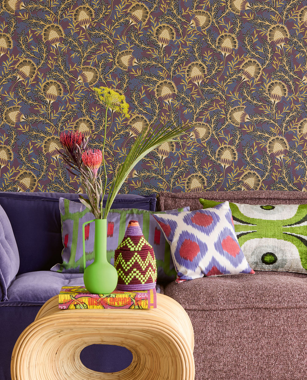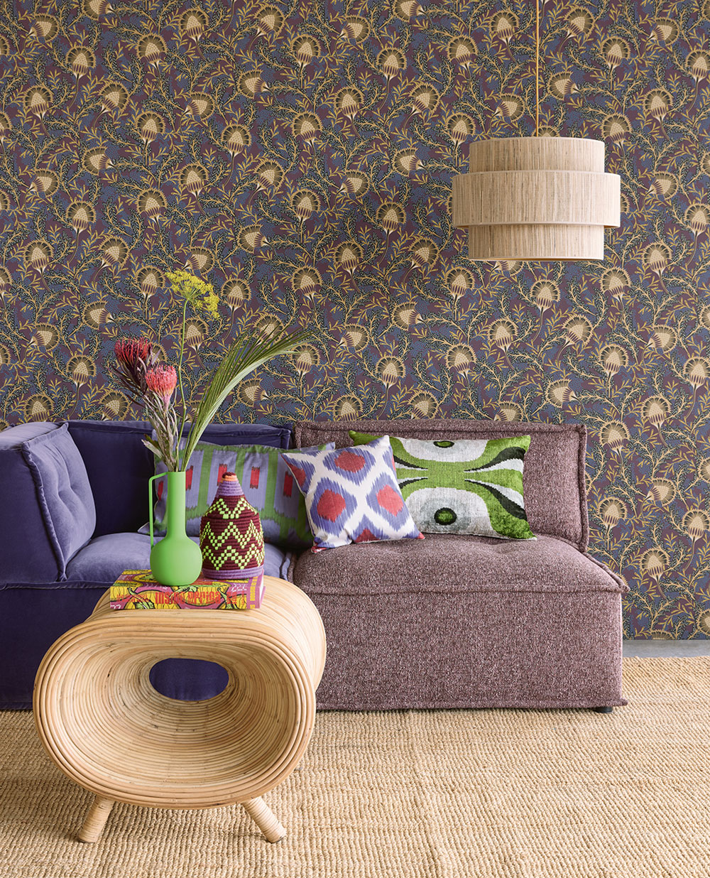 With Solange, your walls will blossom with the joyful colors of floral designs inspired by traditional African batik. Fall in love with a modern nomadic spirit through ikat-inspired patterns. Or opt for a stylish zigzag motif with delicate metallic accents, paying tribute to the beautiful Kuba fabrics. This unique collection pairs perfectly with a palette of natural shades, from vibrant tones to soft, earthy hues reminiscent of raffia and batik rugs.