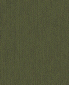 Non-woven wallpaper, irregular stripes in shades of green, small gold dots.