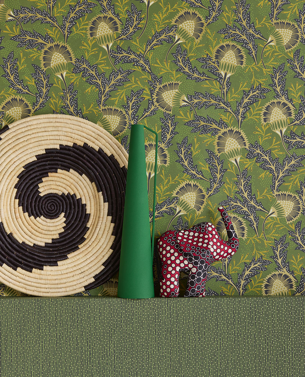 With Solange, your walls will blossom with the joyful colors of floral designs inspired by traditional African batik. Fall in love with a modern nomadic spirit through ikat-inspired patterns. Or opt for a stylish zigzag motif with delicate metallic accents, paying tribute to the beautiful Kuba fabrics. This unique collection pairs perfectly with a palette of natural shades, from vibrant tones to soft, earthy hues reminiscent of raffia and batik rugs.