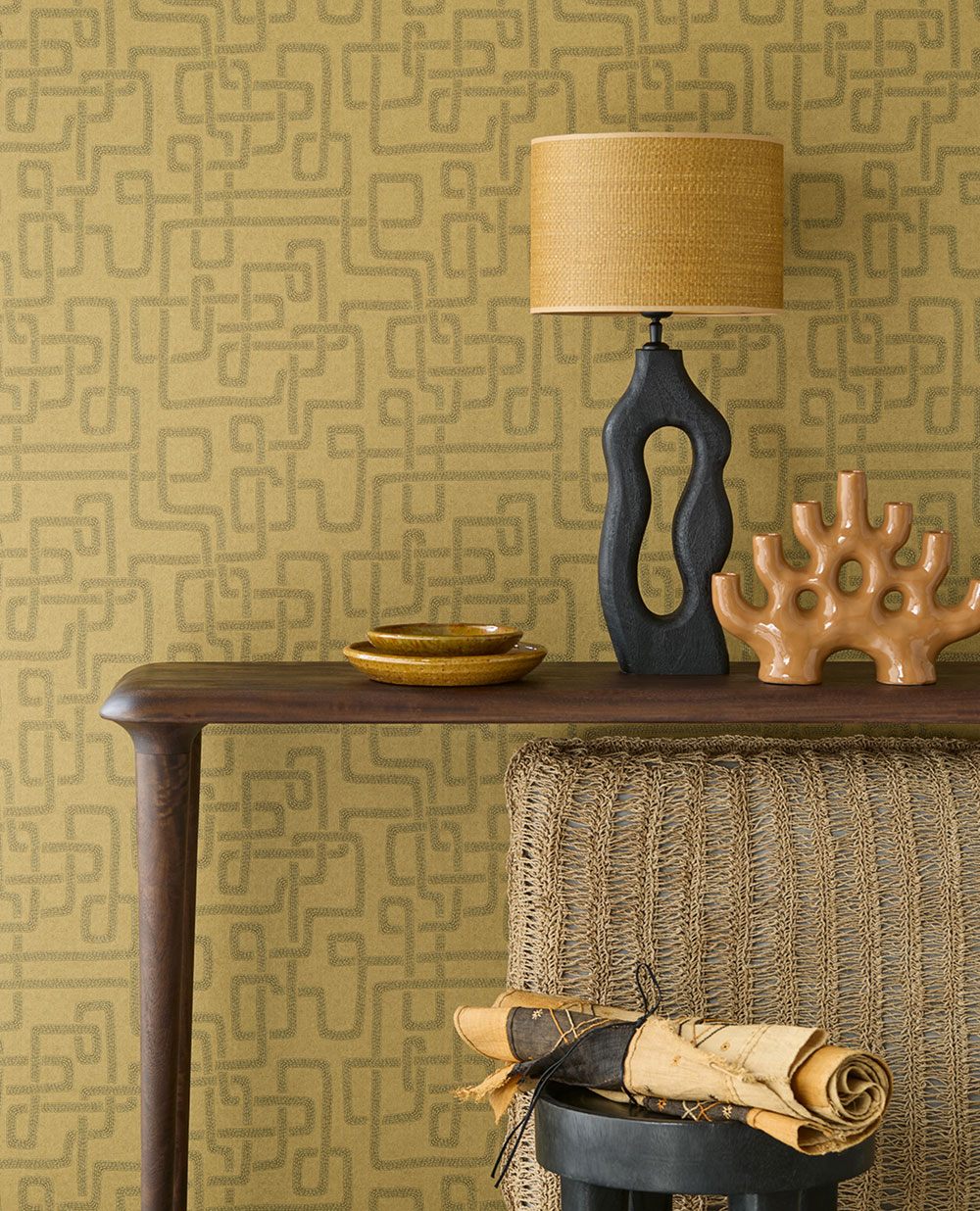 With Solange, your walls will blossom with the joyful colors of floral designs inspired by traditional African batik. Fall in love with a modern nomadic spirit through ikat-inspired patterns. Or opt for a stylish zigzag motif with delicate metallic accents, paying tribute to the beautiful Kuba fabrics. This unique collection pairs perfectly with a palette of natural shades, from vibrant tones to soft, earthy hues reminiscent of raffia and batik rugs.