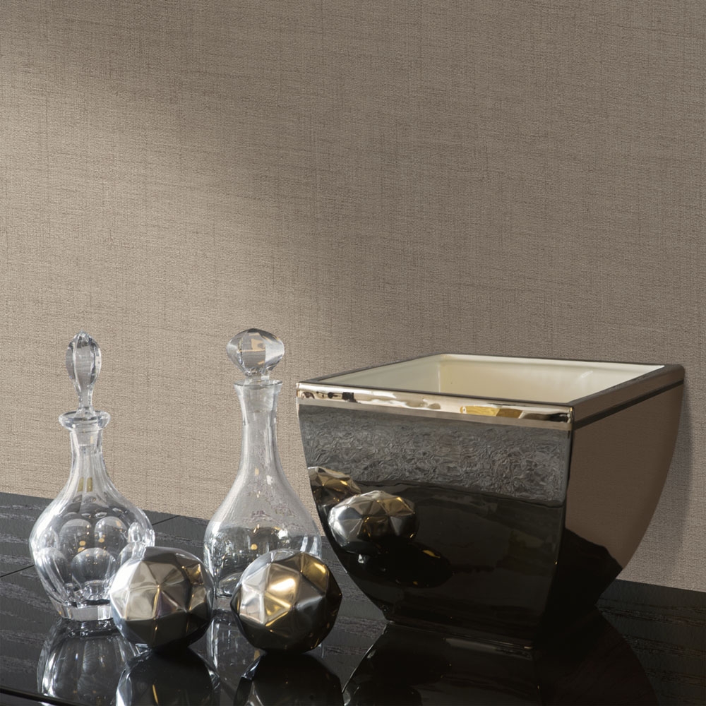 Non-woven wallpaper with a vinyl surface - finely embossed fabric design in a brown color with a soft metallic gloss.