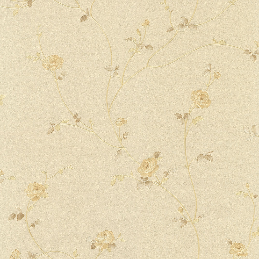Romantic floral wallpaper - creamy background with a delicate leaf decor, a glossy beige rose pattern. Can be easily combined with related wallpapers.