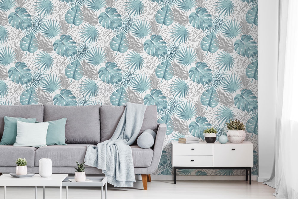 Smooth, white, non-woven wallpaper with a palms and monstera motif, in shades of turquoise and finely embossed gray-silver with silver glitters.