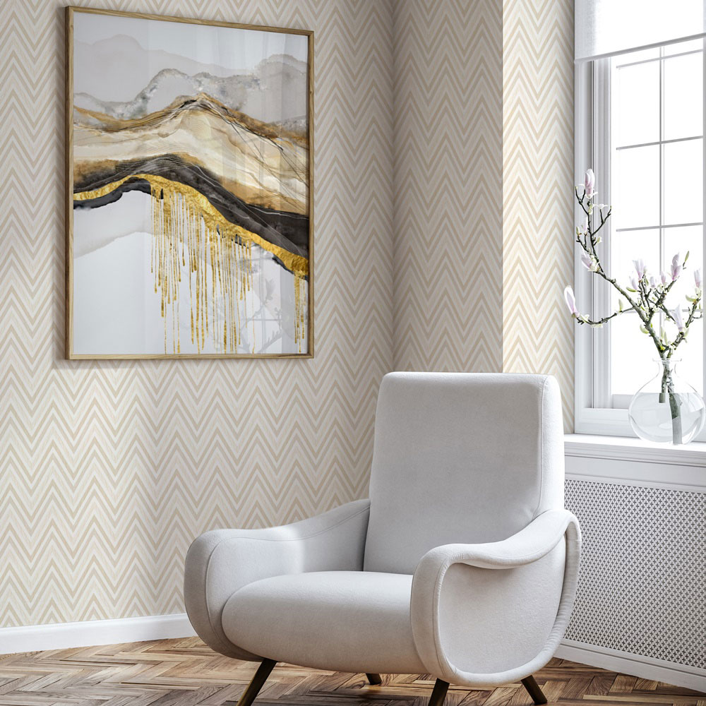 Non-woven wallpaper with vinyl surface, zigzag pattern in shades of cream and gold-beige.