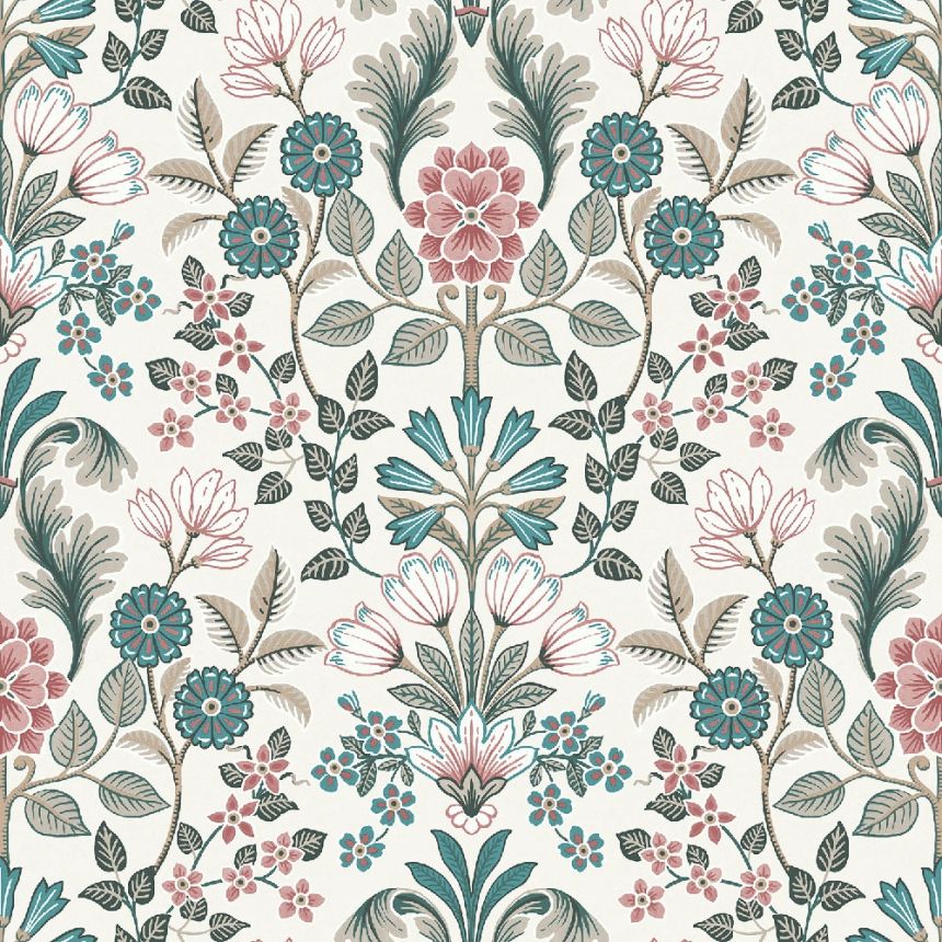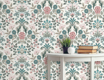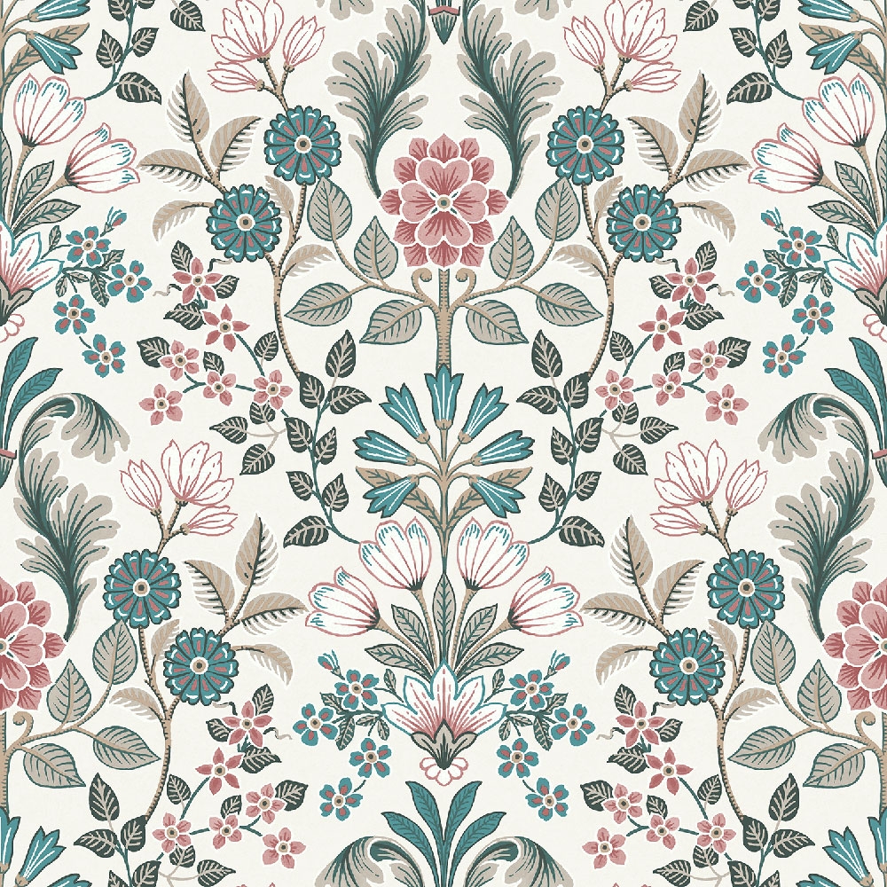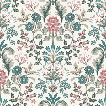 Texture resembles a very finely structured fabric in a creamy color, pattern in shades of turquoise, beige, old pink and burgundy.