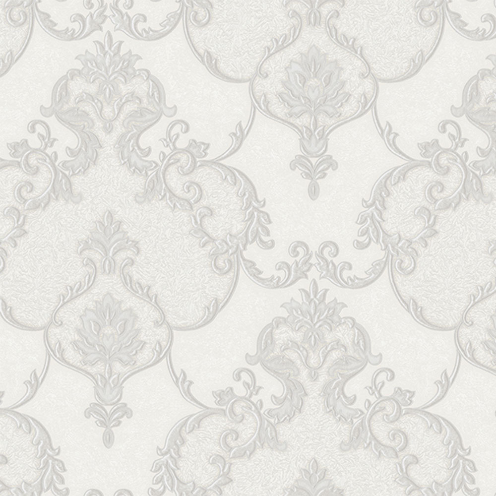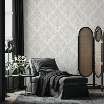 Luxurious grey-cream non-woven wallpaper, baroque pattern with semi-gloss, small silver glitters.