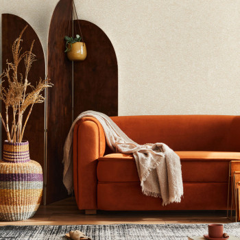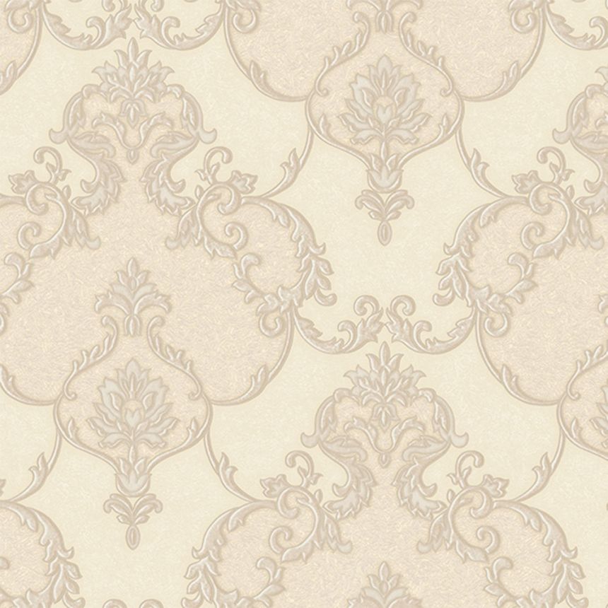 Luxurious light beige non-woven wallpaper, baroque stucco pattern with small glitters and a soft semi-gloss.