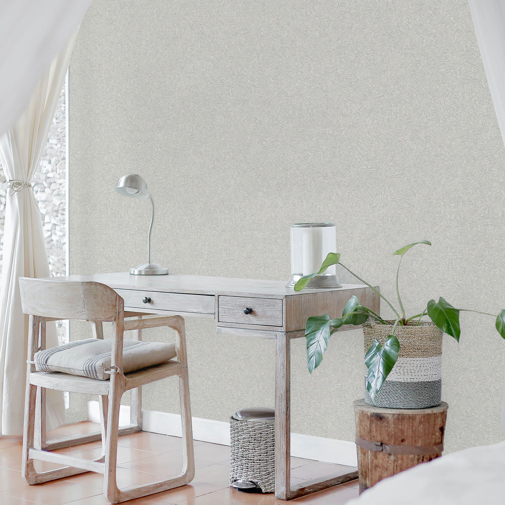 Luxurious grey non-woven wallpaper, baroque stucco pattern with small glitters and a soft semi-gloss.