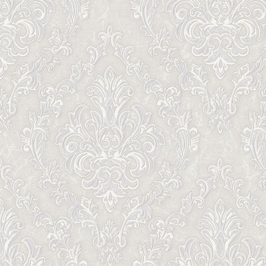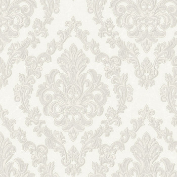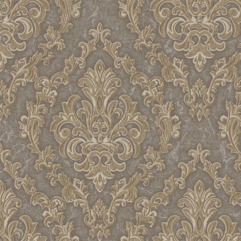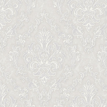 Luxurious grey non-woven wallpaper with vinyl surface, semi-glossy baroque pattern with small silver glitters.