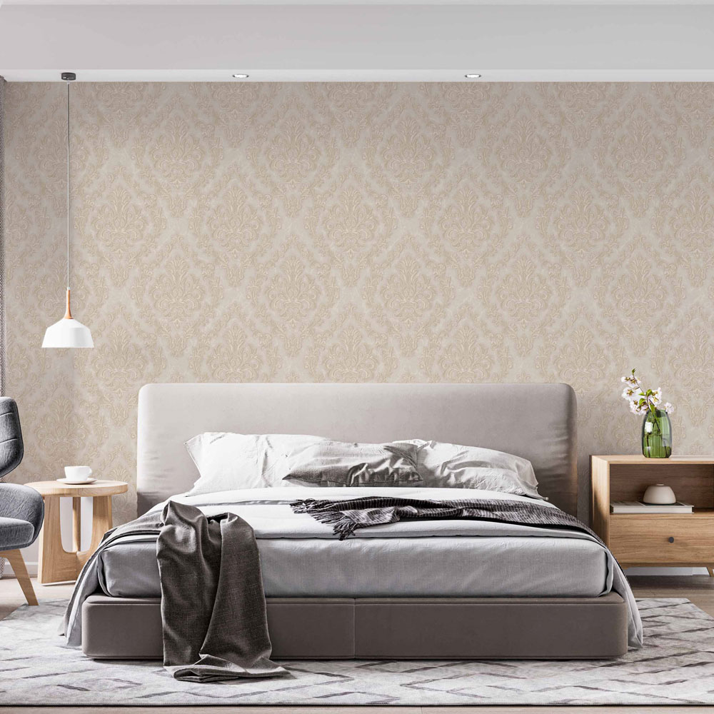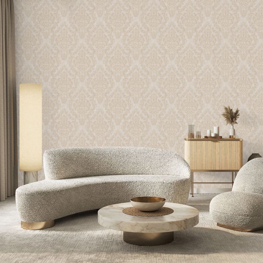 Luxury beige non-woven wallpaper with vinyl surface, semi-gloss beige baroque pattern with small glitters.