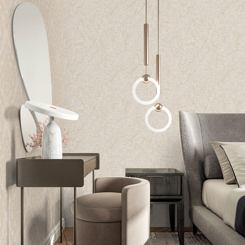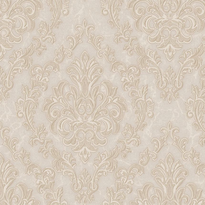 Luxurious beige non-woven wallpaper, baroque stucco pattern with small gold glitters.