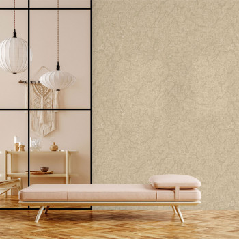 Luxurious beige non-woven wallpaper, baroque stucco pattern with small gold glitters.