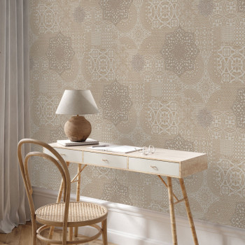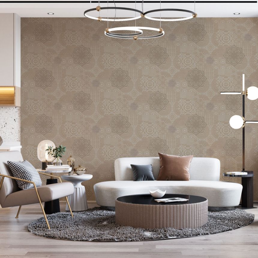 Luxurious brown-beige non-woven wallpaper, imitation of embroidery and lace, small glitters in places.