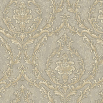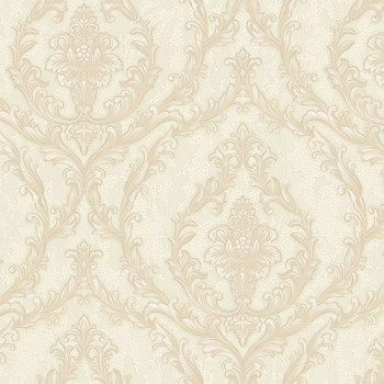 Luxurious light beige non-woven wallpaper, brown baroque pattern with small gold glitters.
