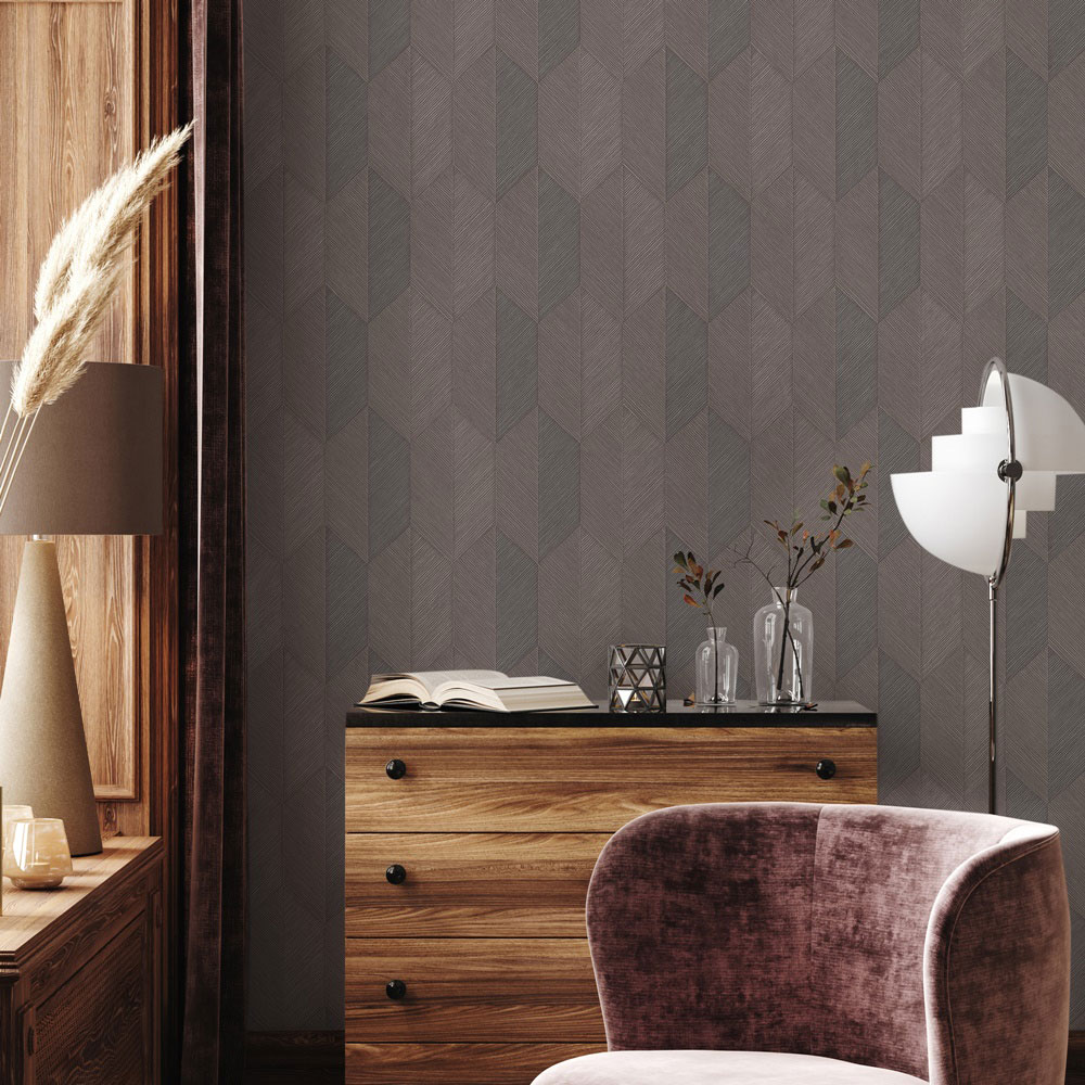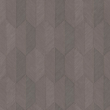 Semi-glossy non-woven wallpaper with vinyl surface, structured geometric pattern in shades of brown and brown-gray.