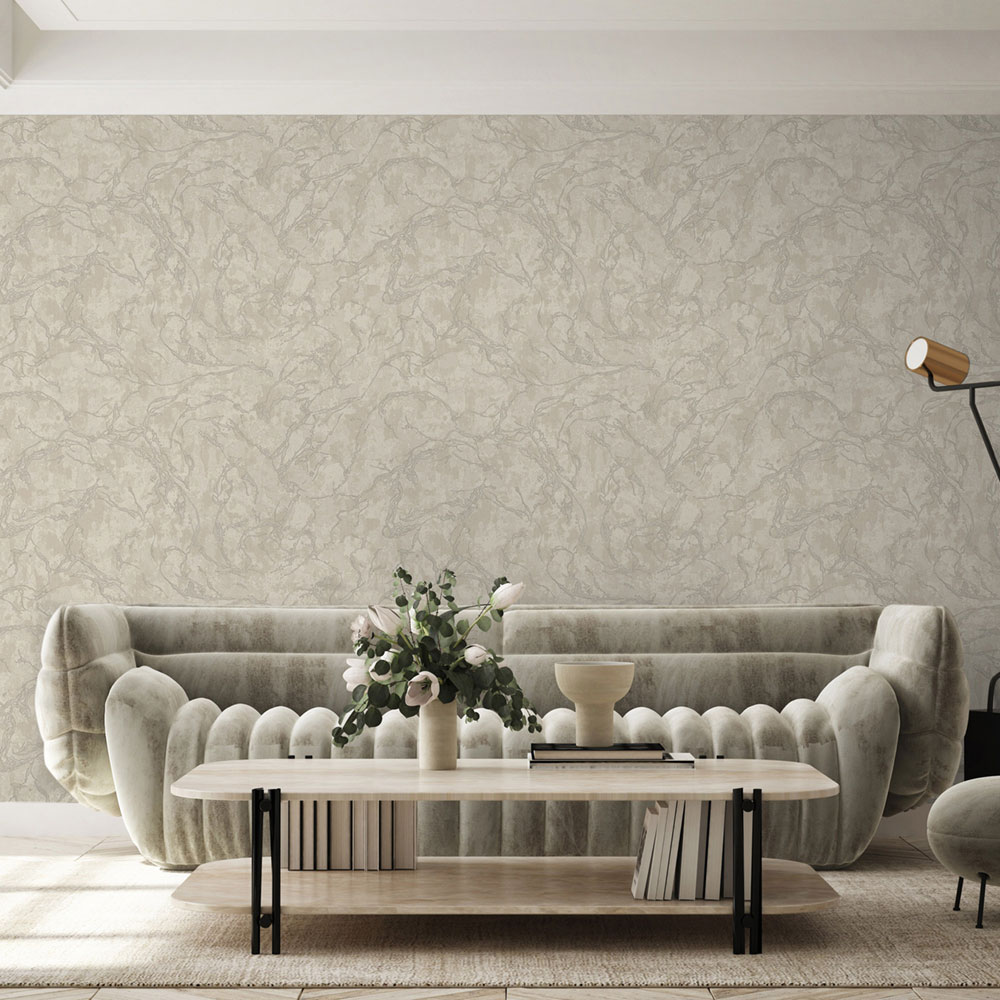 Luxury non-woven wallpaper with vinyl surface, light beige background with metallic semi-gloss, metallic marbling.