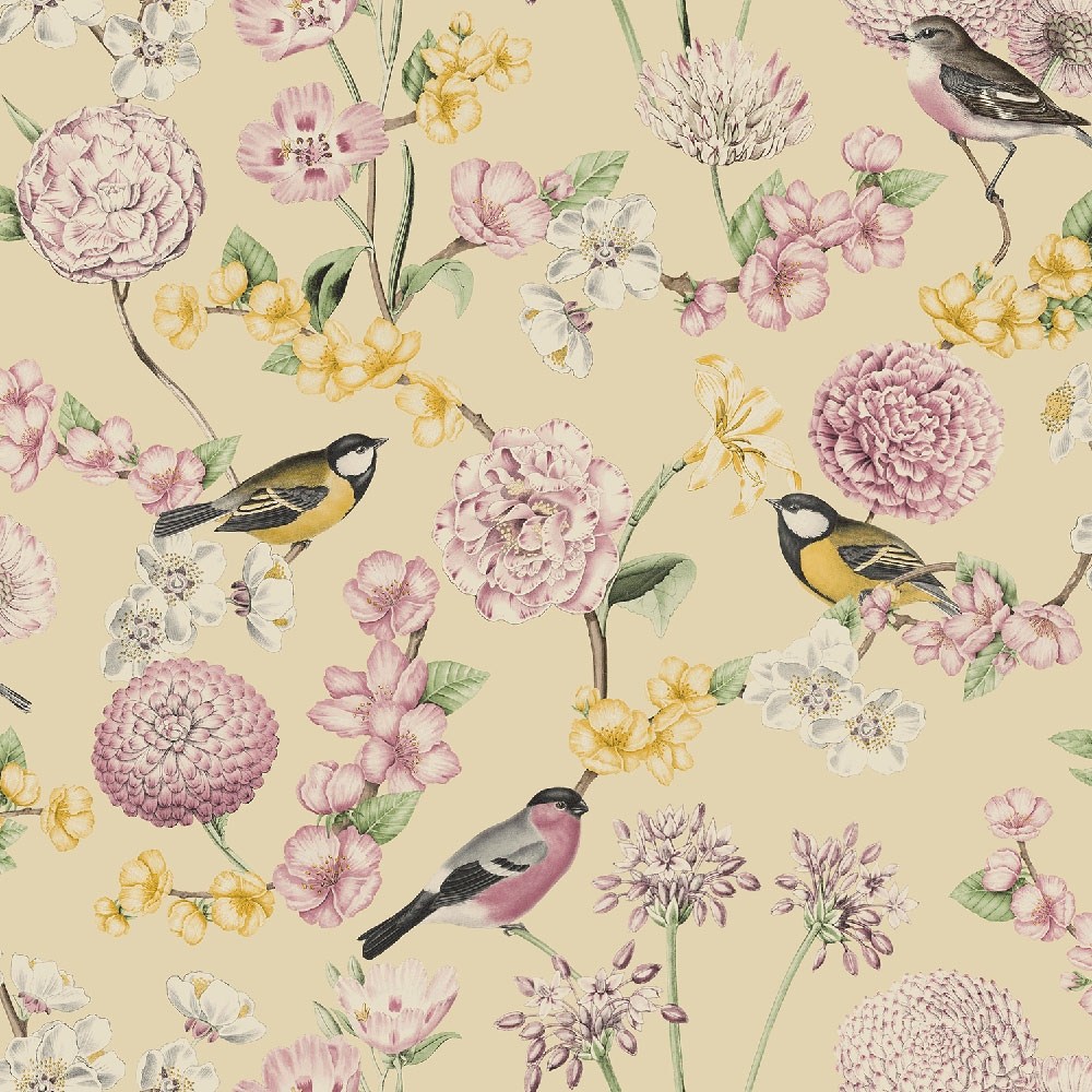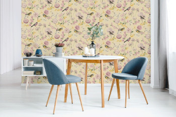 Colorful floral pattern with birds on an ocher background. Non-woven backing, smooth washable vinyl surface.