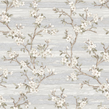 Luxury non-woven wallpaper with vinyl surface, cream-beige floral pattern on a distinctively embossed, semi-gloss, grey-cream background.