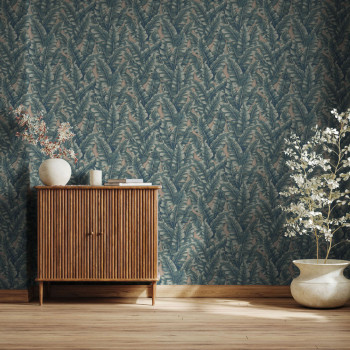 Luxury non-woven wallpaper with vinyl surface, banana leaf motifs in shades of semi-gloss blue and brown.
