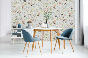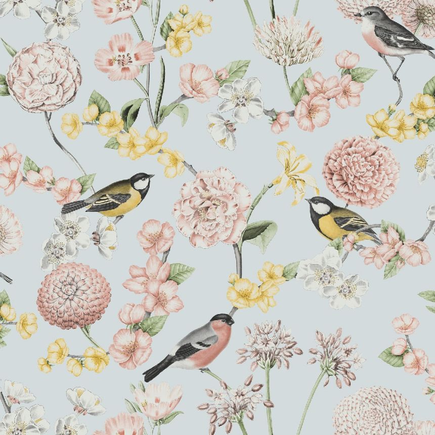Colorful floral pattern with birds on a light blue background. Non-woven backing, smooth washable vinyl surface.
