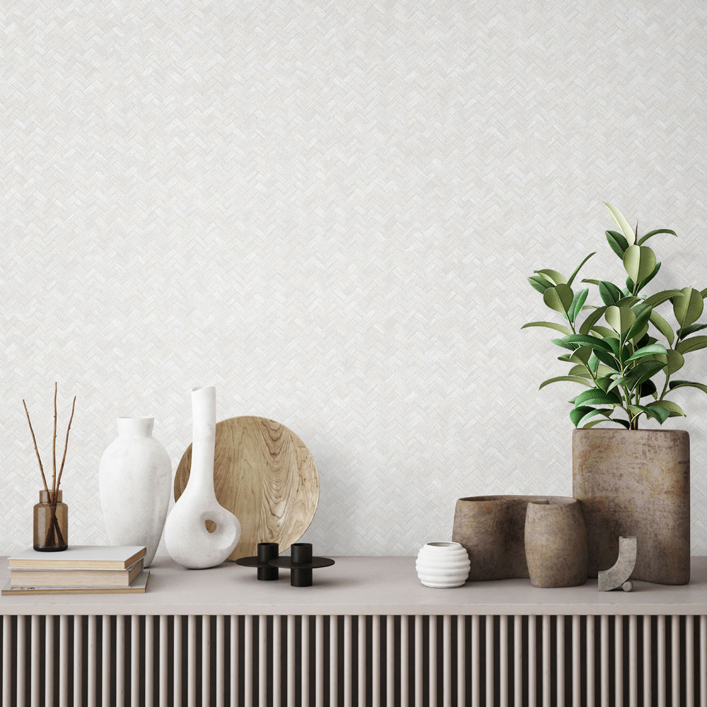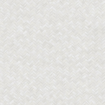 Non-woven wallpaper with vinyl surface, imitation of bast mat, shades of white and gray, pearl reflections.